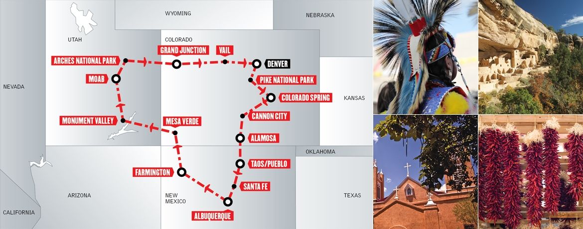 La prima tappa è il Chaco Culture National Historical Park, fulcro delle cerimonie e del commercio della preistoria dell’area dei Four Corners. Più tardi visitate l’Aztec Ruins National Monument che preserva strutture e artefatti dell’Ancestral Pueblo, datati anche 1100 D.C.